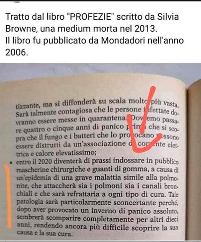 Un'epidemia simile al Coronavirus era stata prevista nel libro di Sylvia BrowneSylvia Browne (all'anagrafe Sylvia Celeste Shoemaker) era una sensitiva proveniente da una famiglia di medium.Personaggio controverso e spesso al centro del dibattito, ha raggiunto il successo grazie alle sue straordinarie esperienze medianiche, avute sin da quando era bambina.Molto celebre in America, i suoi libri sono bestseller tradotti in tutto il mondo.La Browne ha anche fondato una chiesa sincretista in California (la Society of Novus Spiritus) e partecipato come consulente per polizia e FBI a oltre 100 casi di sparizione e omicidi.